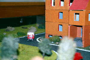 | Nein, keine elektrische Eisenbahn für Feuerwehrmänner, das ist ein Lehrmittel. Zur Ausbildung im theoretischen Bereich gehört auch taktisches Planspiel. Die Koordination der Löschzüge sowie der einzelnen Gruppen bzw. Trupps kann man auch mit Modellautos üben. |